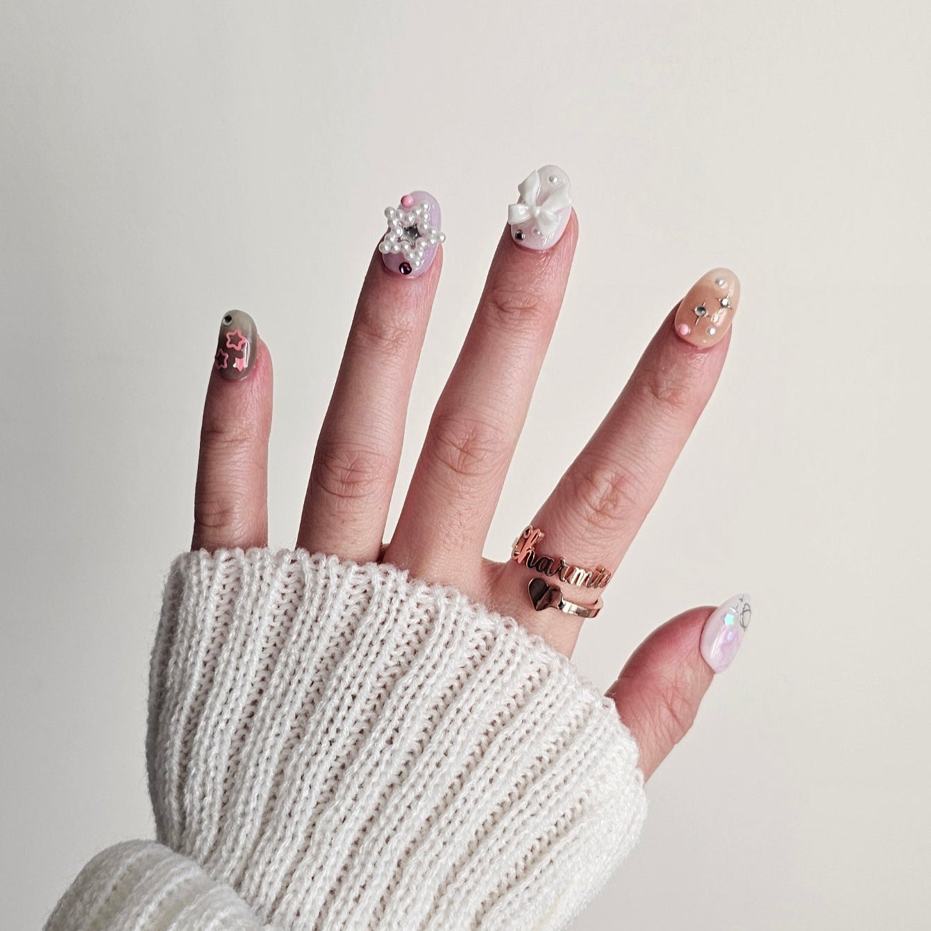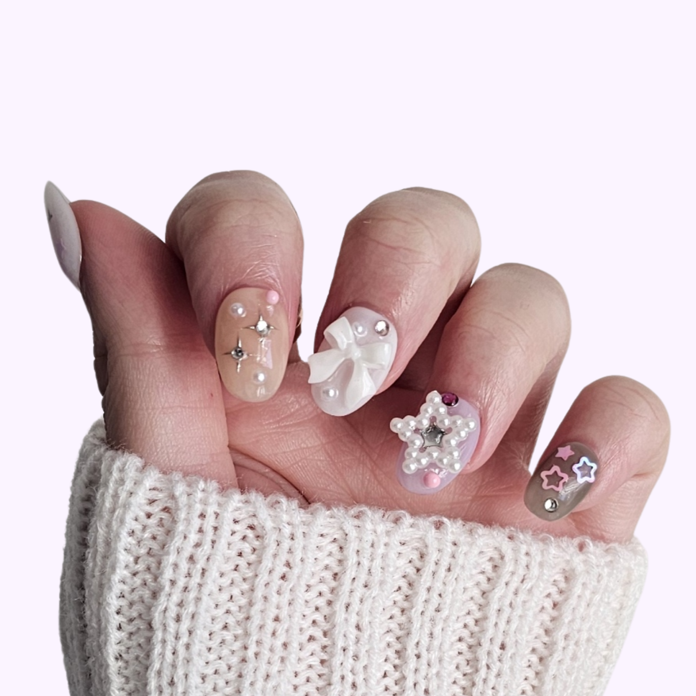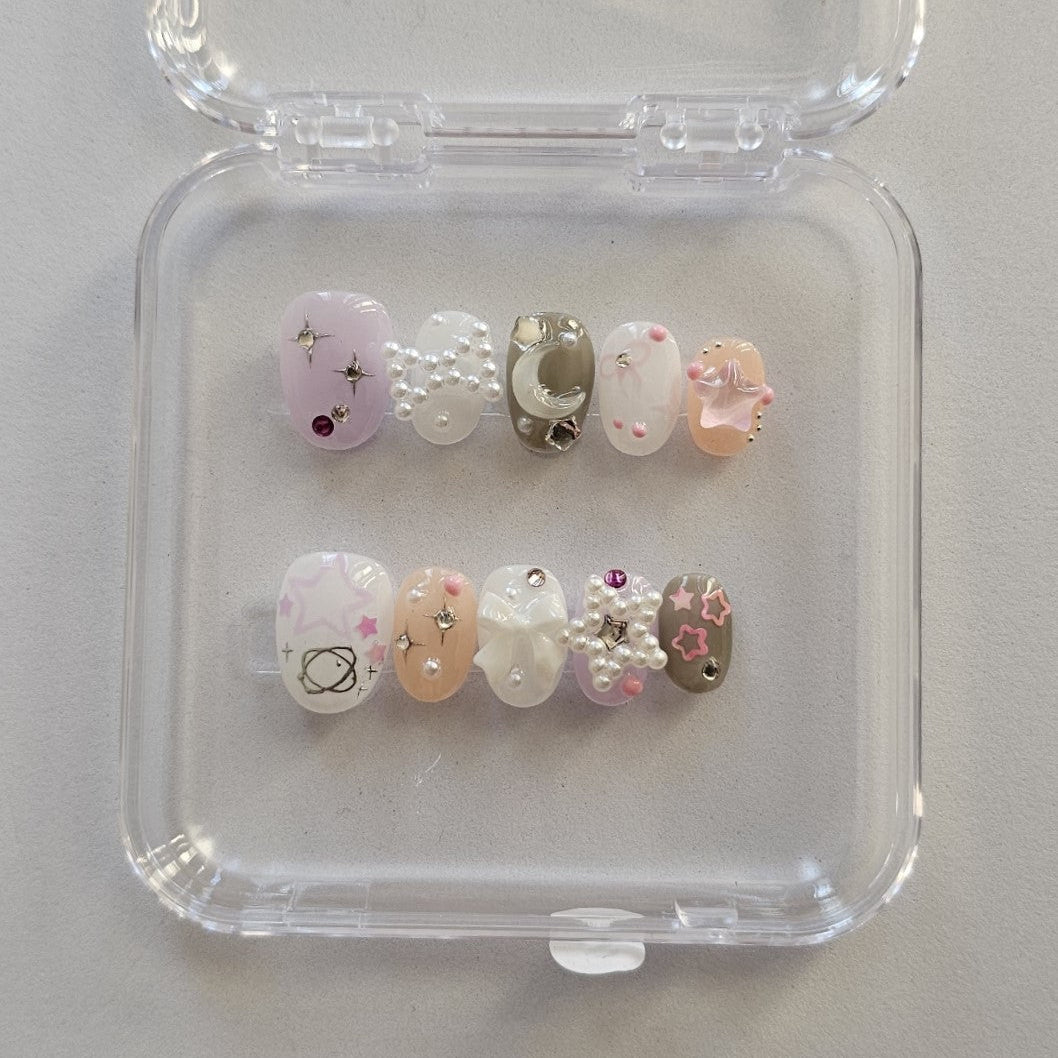 'Cosmic Trinket' is part of our Y2K Short collection. Featuring pearls, moons, stars, and playful 3D charms across soft pink, lilac, and chrome tones, it’s a whimsical dreamscape for your fingertips