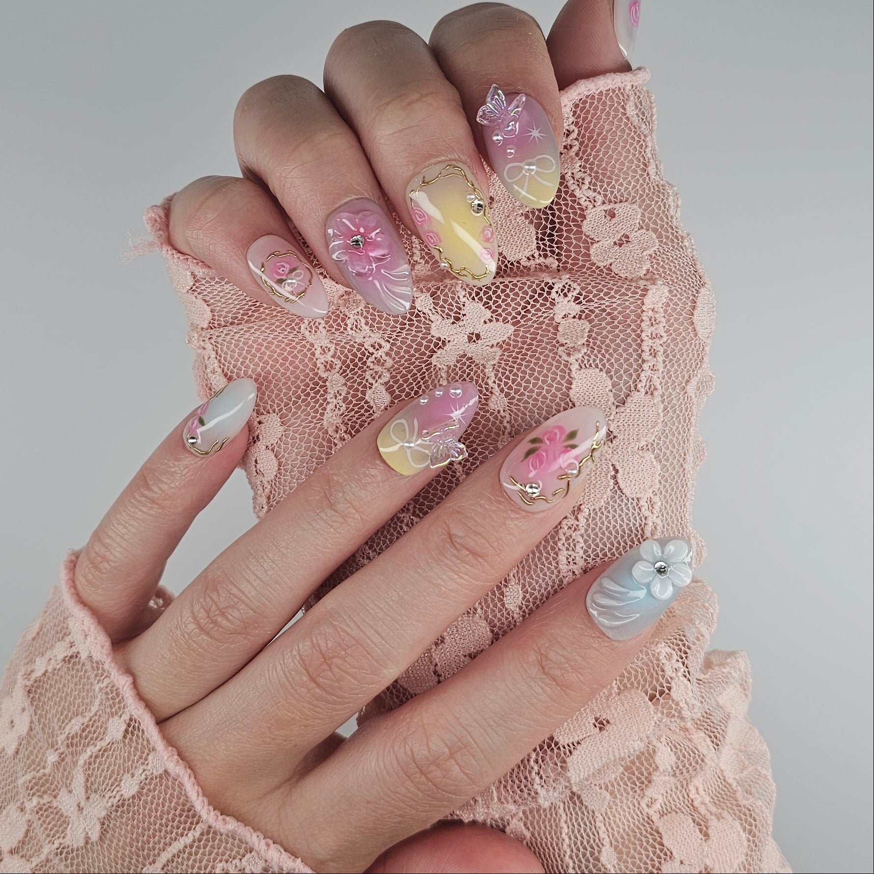 'Rosy Garden’ features Like this Rosy Garden set with hand painted roses, gold chrome accents, and soft 3D florals. Perfect for a garden theme event.