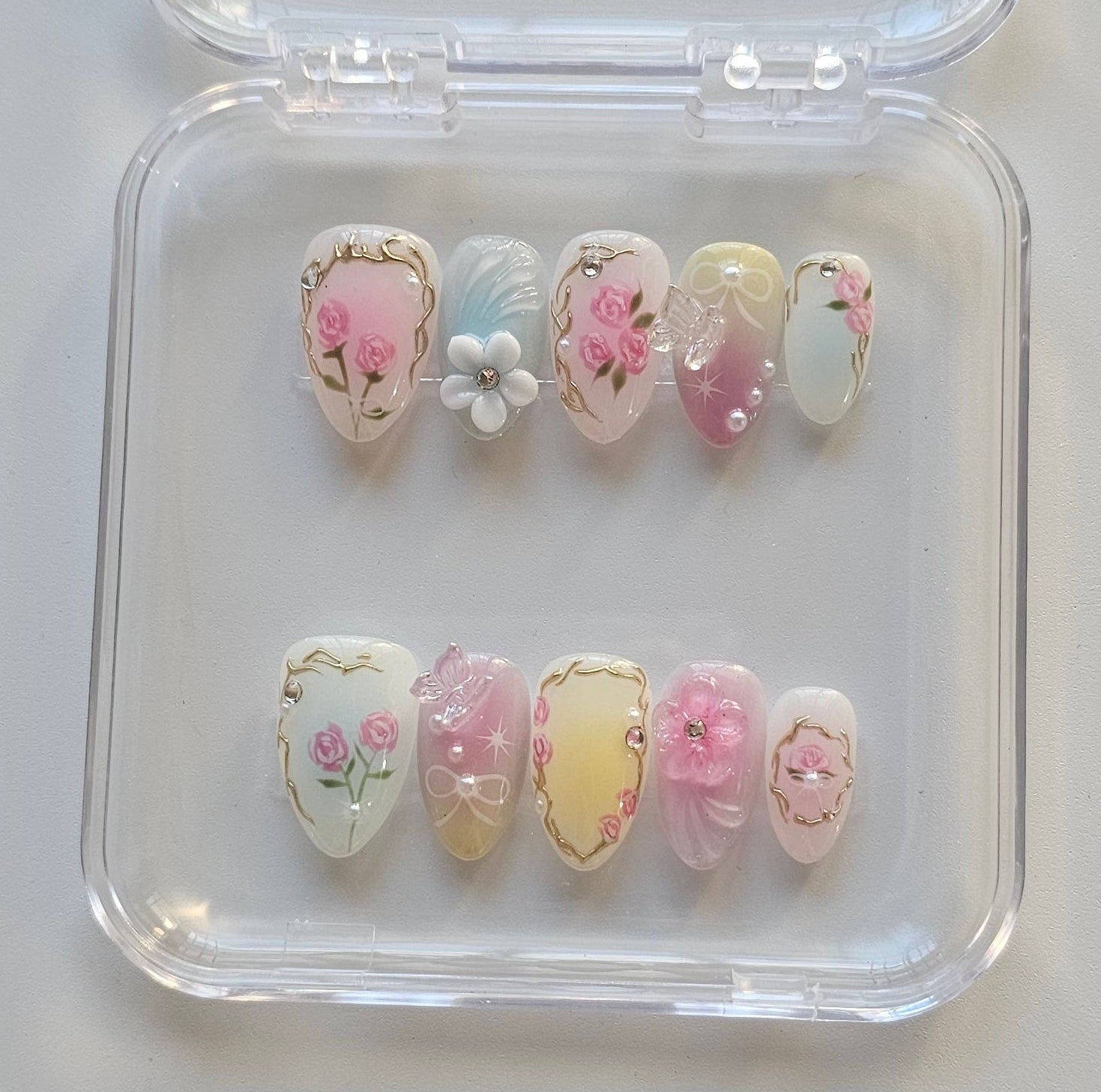 Charmie Press on nails are handmade, using the highest quality gel tips, topped with glossy topcoats. Designed to be worn multiple times.