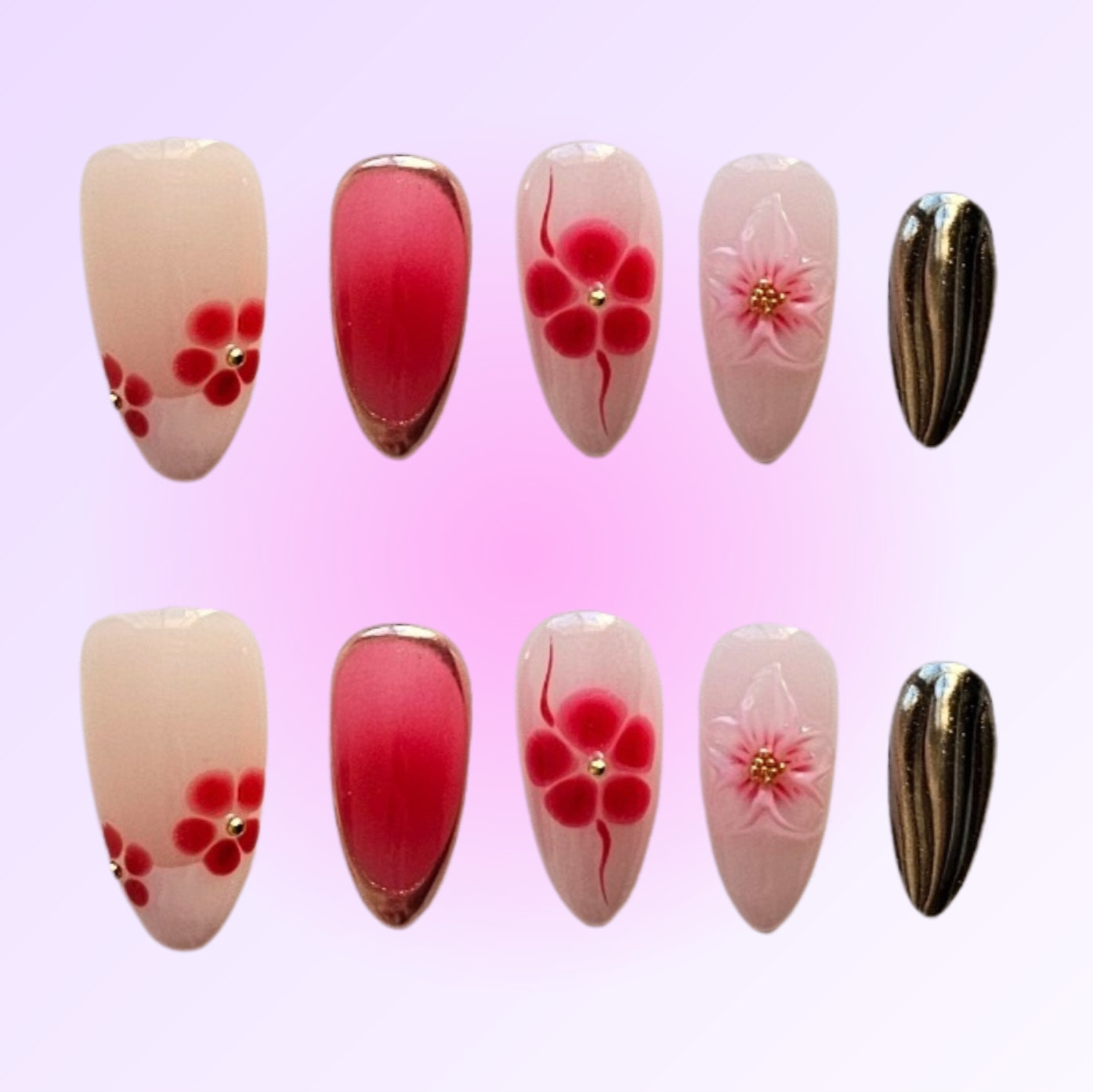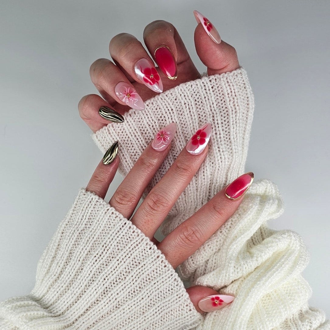'Scarlet Blooms' features soft nude tones with delicate red florals and 3D blossoms, touched with fresh and vintage gold accents that symbolise both timeless beauty and the renewal of spring.