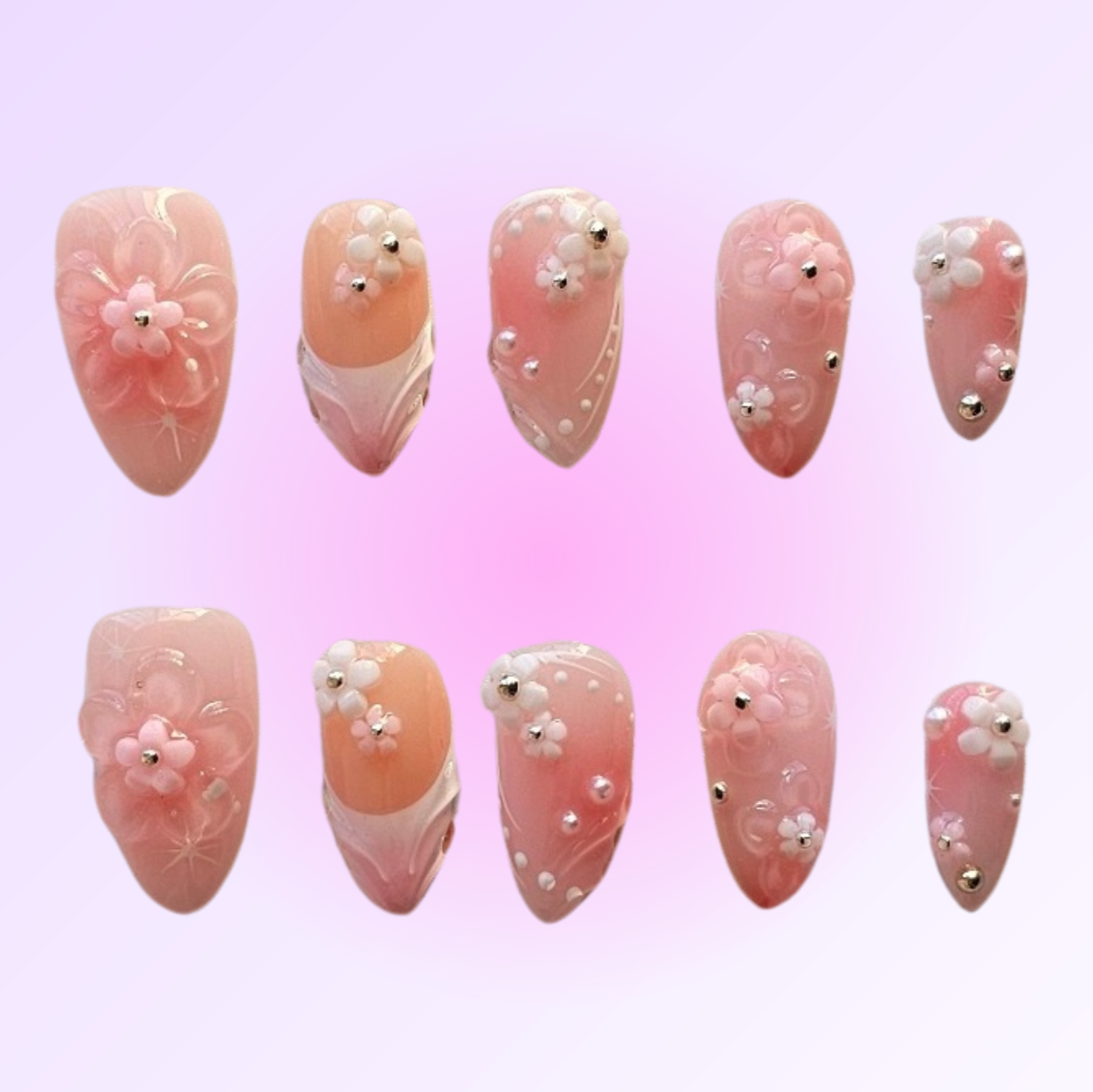 'Cherry Blossoms' is a soft pink design with 3D floral details, pearls, and delicate accents that capture the romance of spring. This set was inspired by Pinterest and Aurukanails, reimagined in Charmie’s dreamy style.