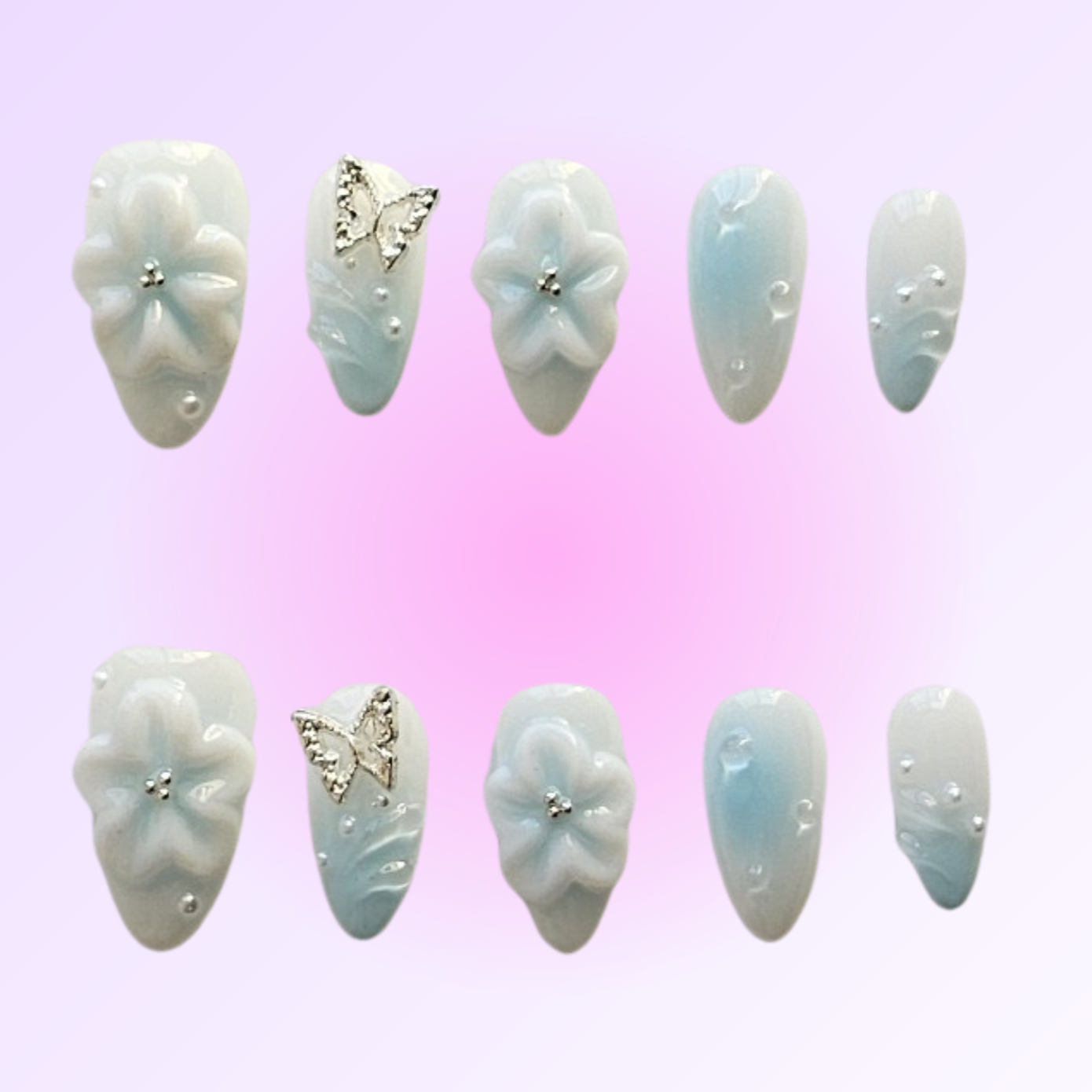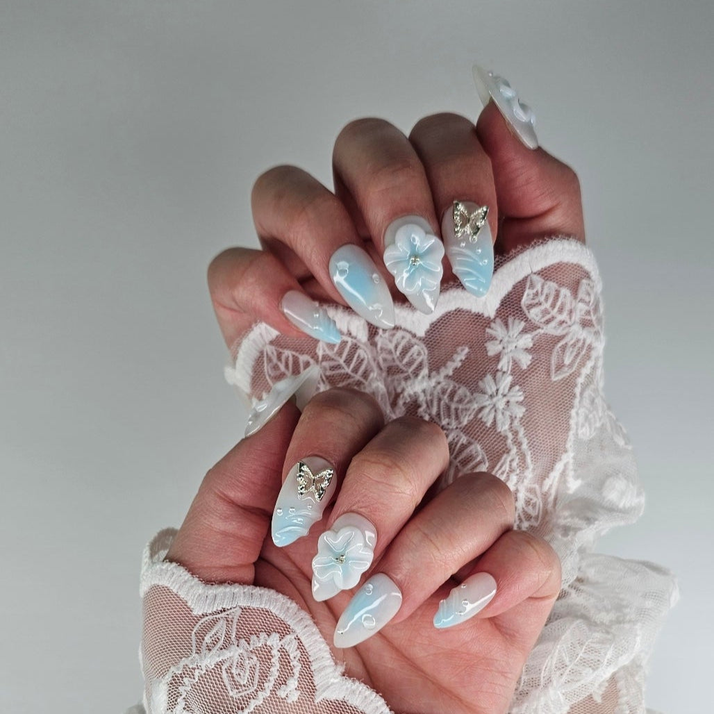 'Sky Blossom' features soft blue ombré with 3D floral and silver butterfly charms creating a dreamy, airy look inspired by spring skies