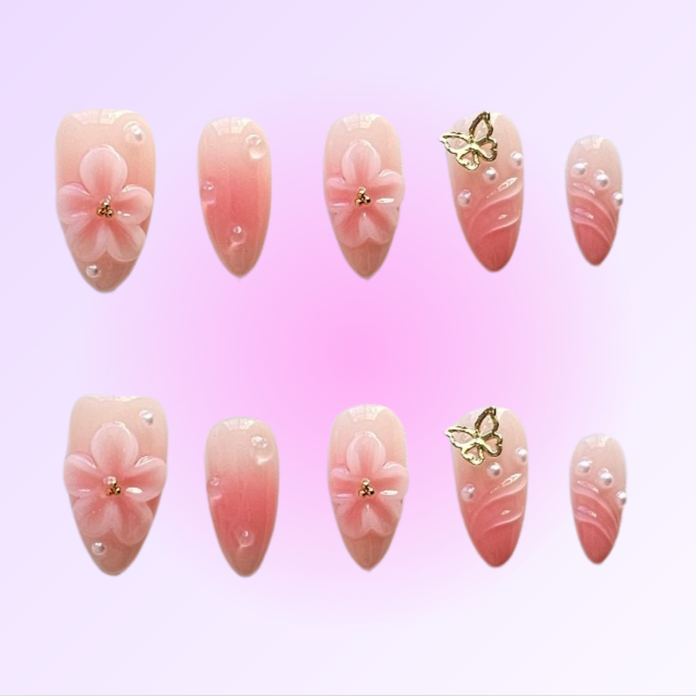 'Pink Blossom' features soft pink ombré with 3D floral and gold butterfly charms creating a dreamy, airy look inspired by pink blossoms.