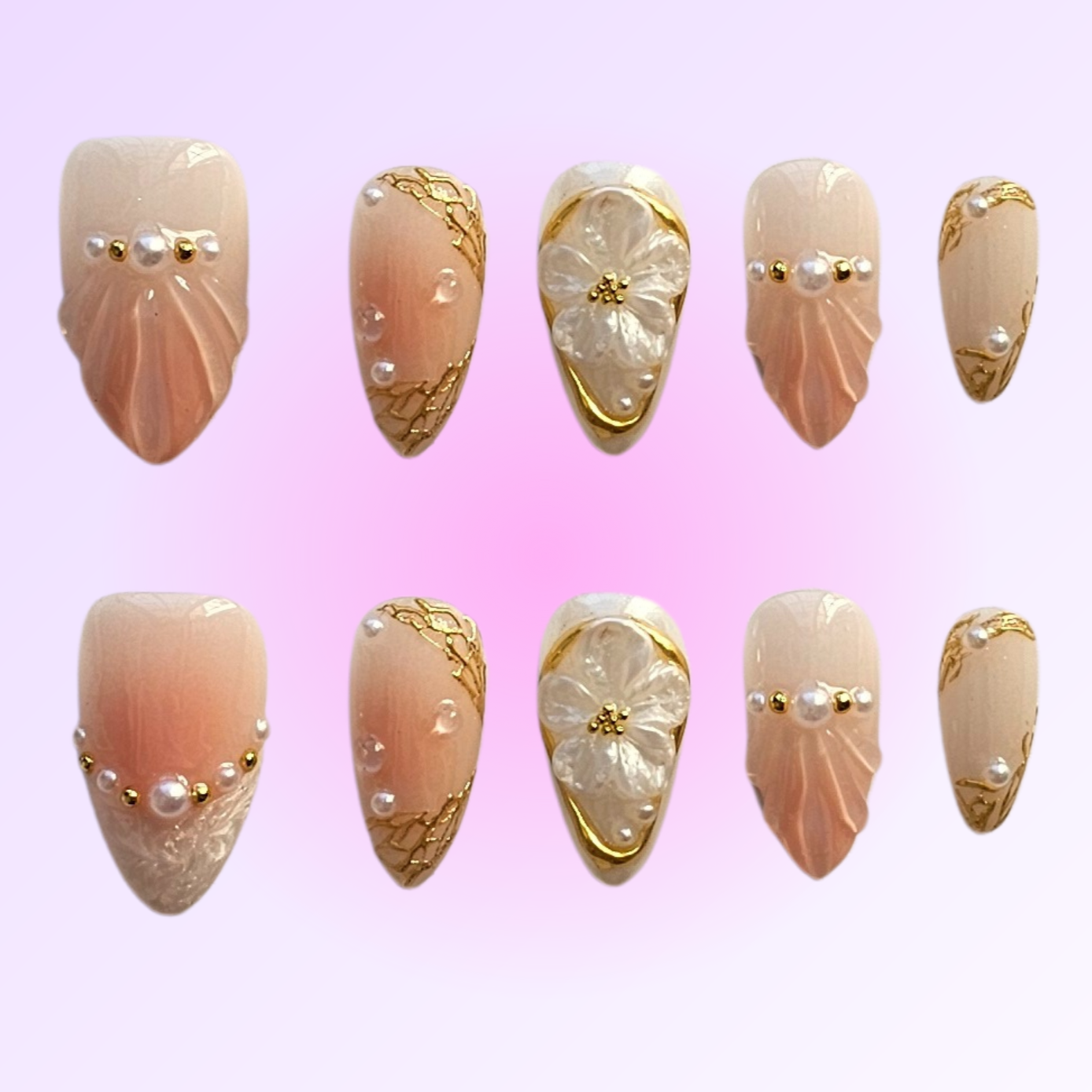 'Golden Blooms' features 3D molded pearly flowers, highlighted by hand-painted gold accents and framed with pearls. The soft nude base creates a timeless contrast, while textured details give each nail a elegant finish.