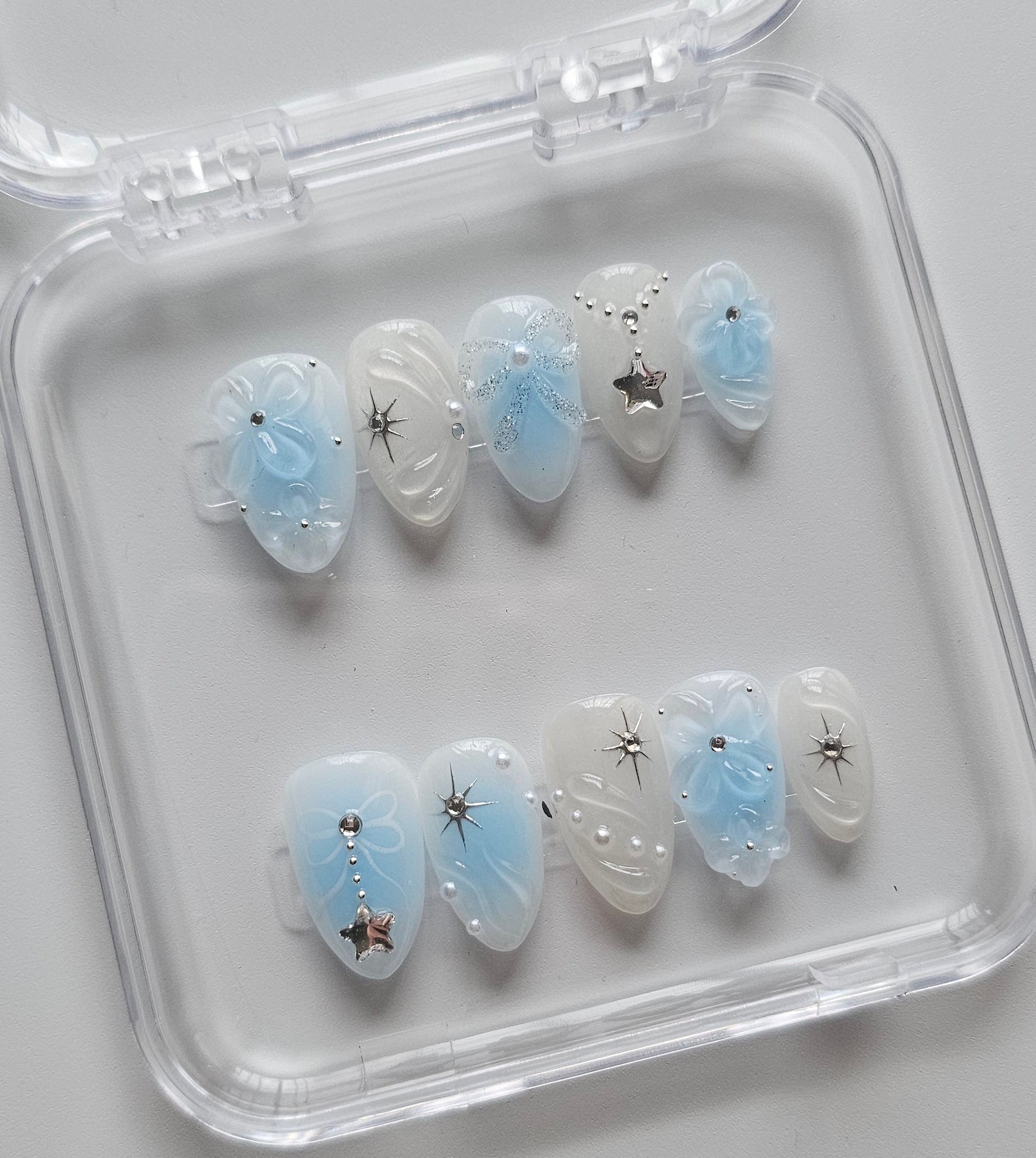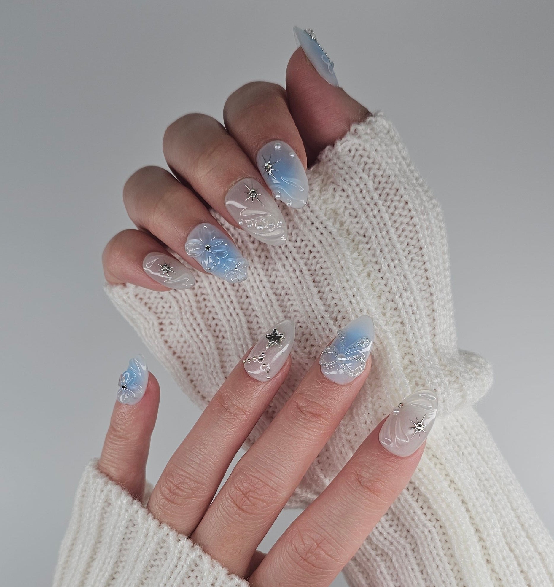 'Twinkle Frost' features icy blue aura tones, minimal silver cat eye shimmer, and hand sculpted florals finished with star accents, perfect for a dreamy winter look.