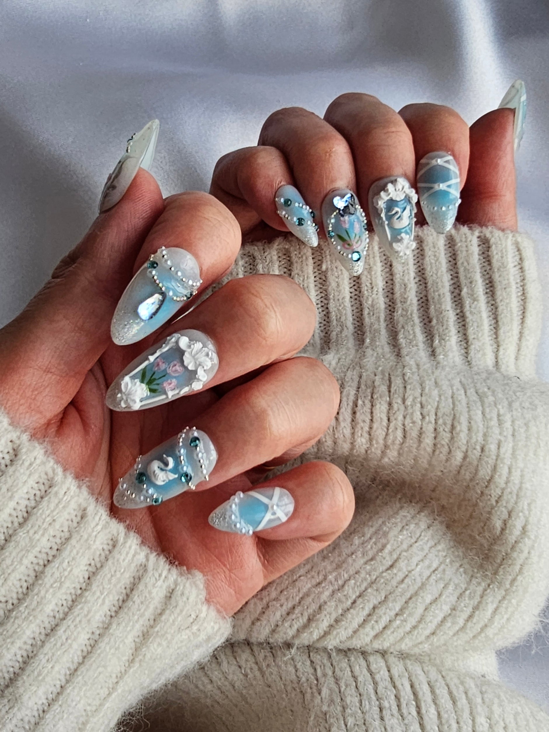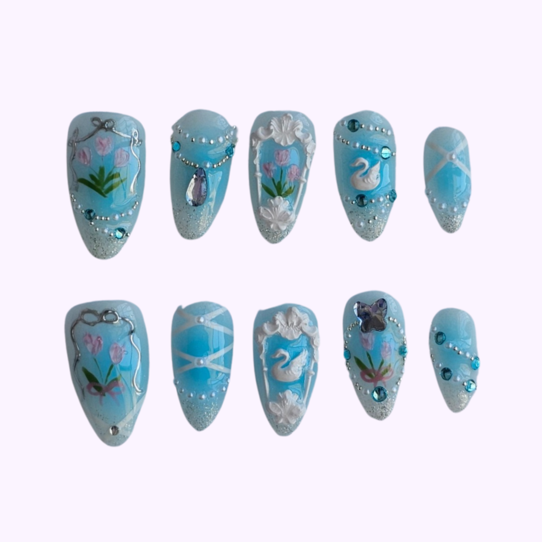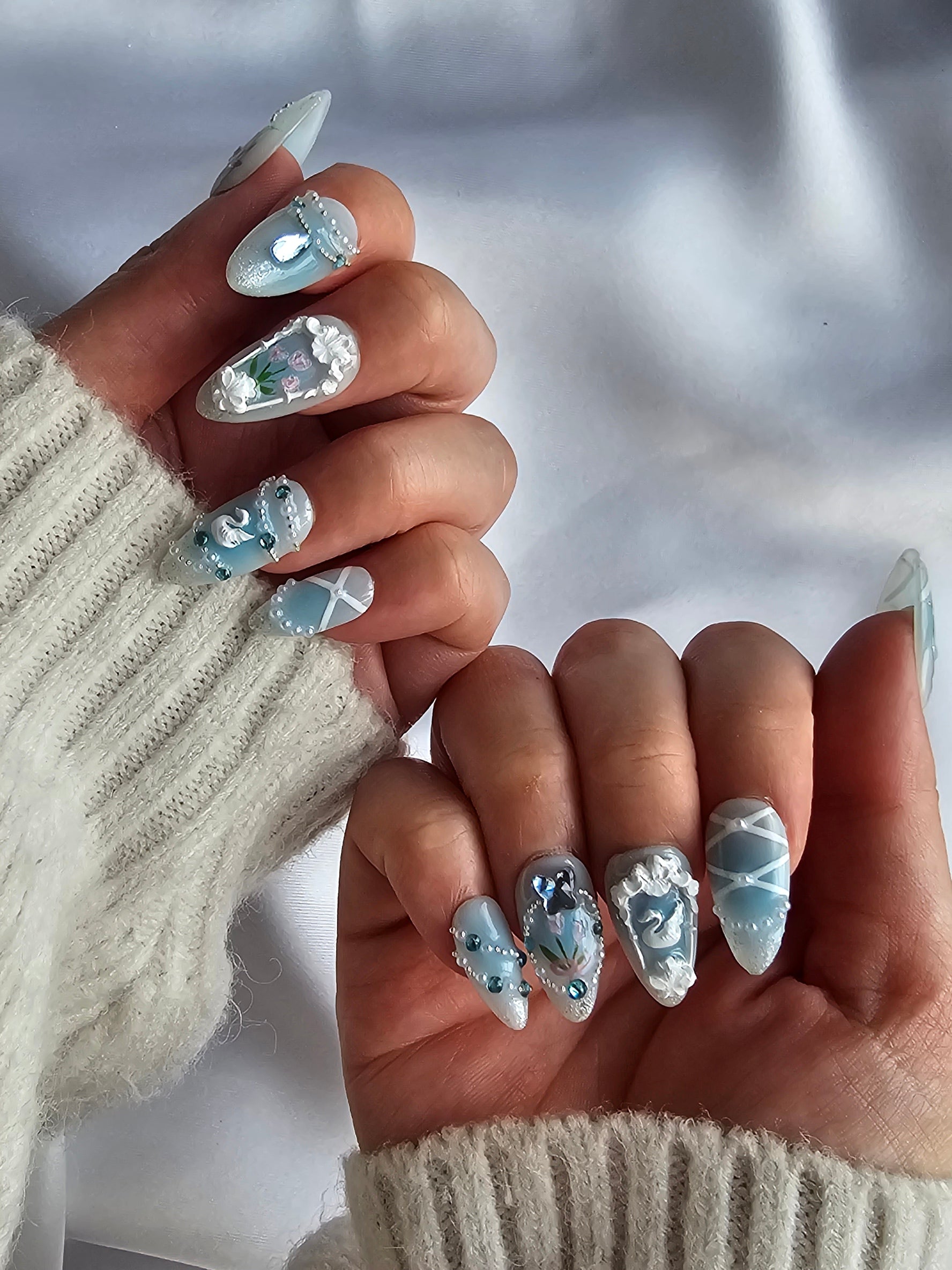 'Whimisical Garden' Limited edition delicate pastel blue press-on nails featuring florals, subtle gems, and accents.