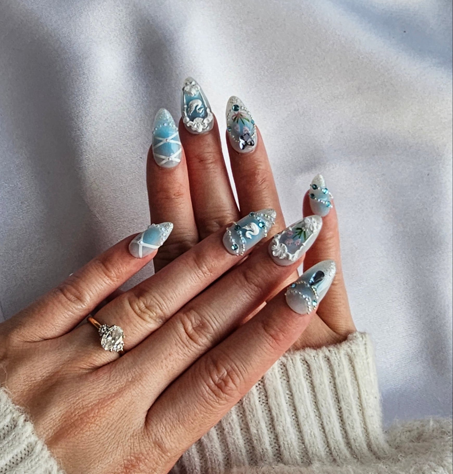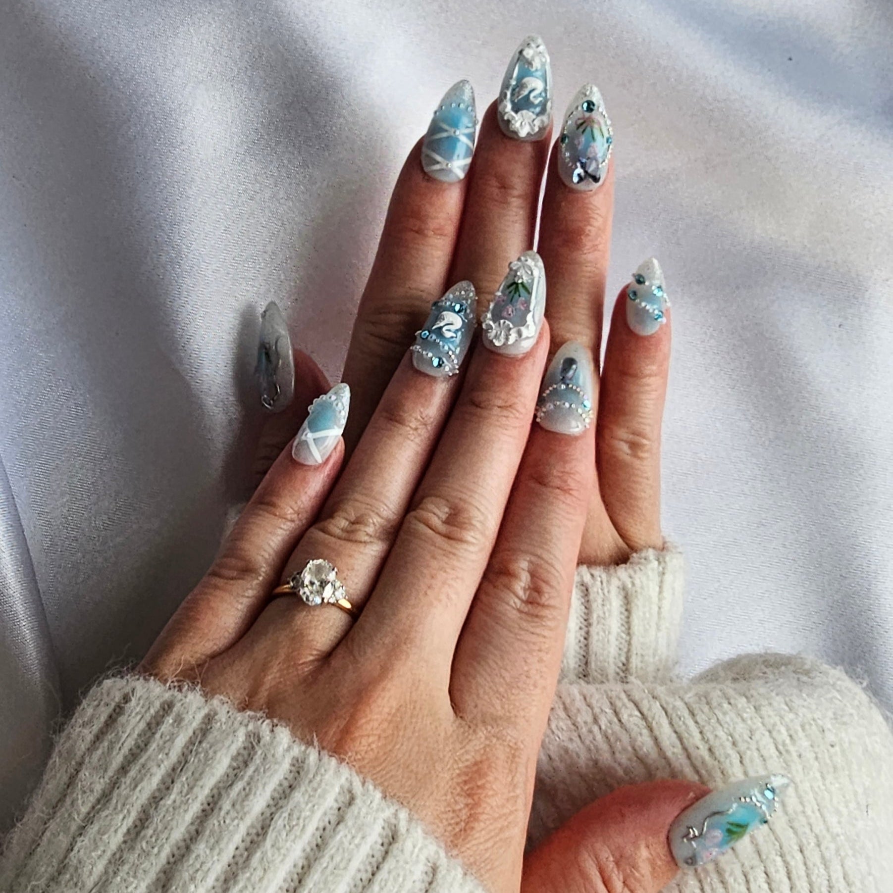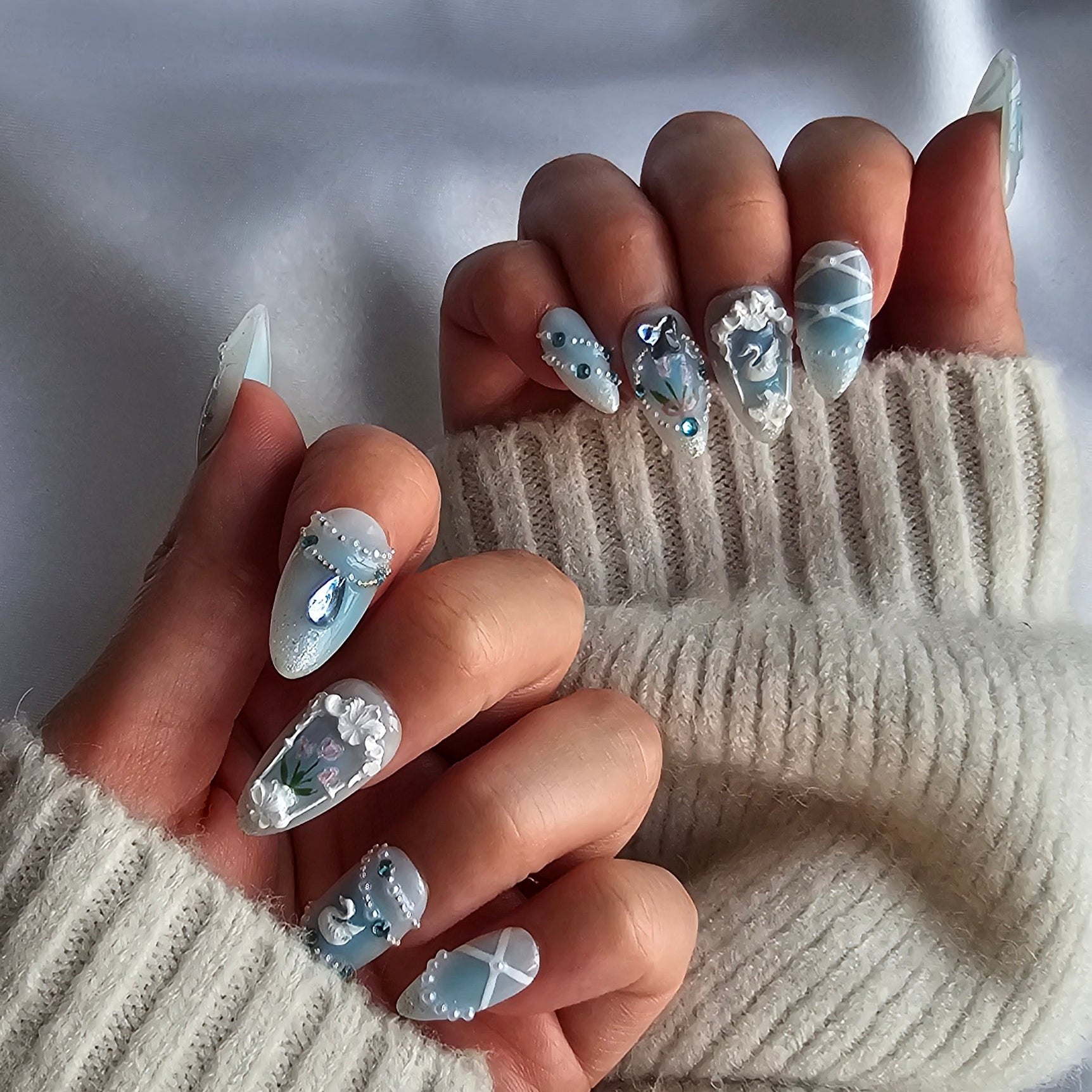 'Whimisical Garden' Limited edition delicate pastel blue press-on nails featuring florals, subtle gems, and accents.